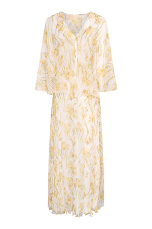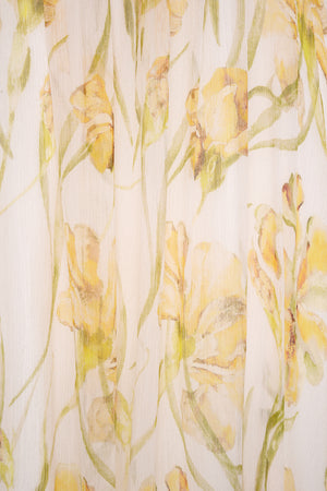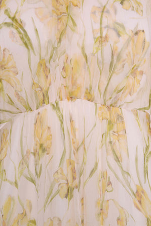 Fekla maxi dress is versatile and elegant, it is cut from light silk chiffon in a custom yellow iris print. The silhouette is inspired by ancient greek draping, featuring a cape that covers shoulders and back.