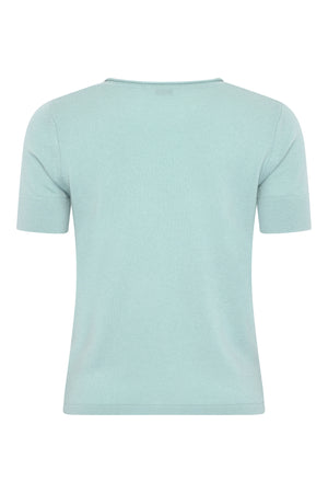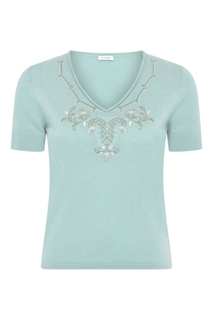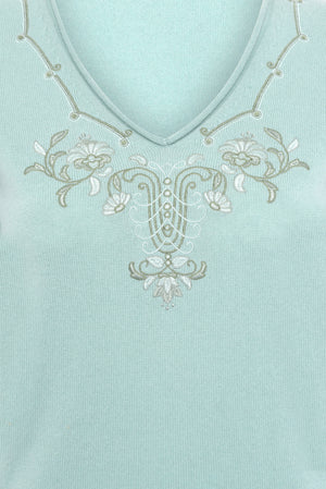 Cashmere blend short-sleeve jumper with floral embroidery in mint colour.
