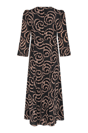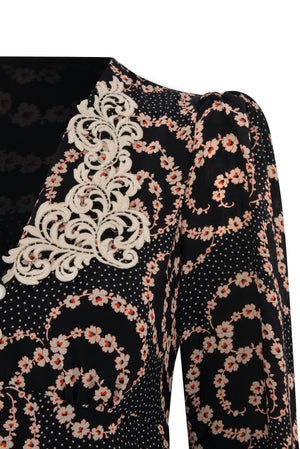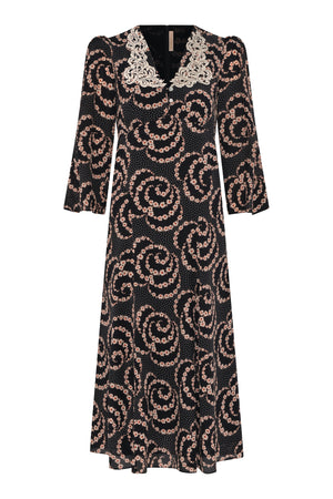 Elena dress is a perfect midi dress finished with lace collar details featuring V-neck and 3/4 sleeves. It is made from silk and covered with a daisy chain print. The fabric is soft, agile and doesn't crinkle easy. Beautiful dress for any occassion.