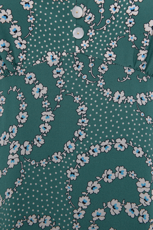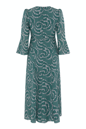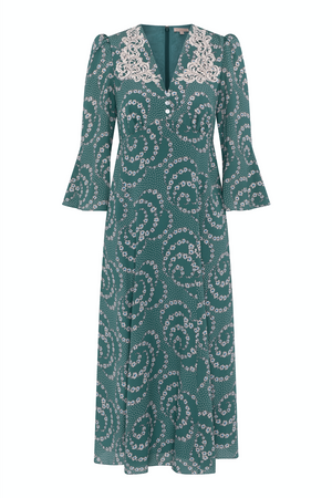 Elena dress is a perfect midi dress finished with lace collar details featuring V-neck and 3/4 sleeves. It is made from silk and covered with a daisy chain print. The fabric is soft, agile and doesn't crinkle easy. Beautiful dress for any occassion.