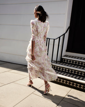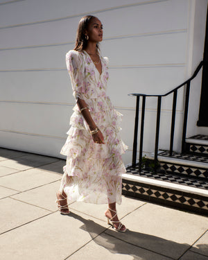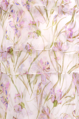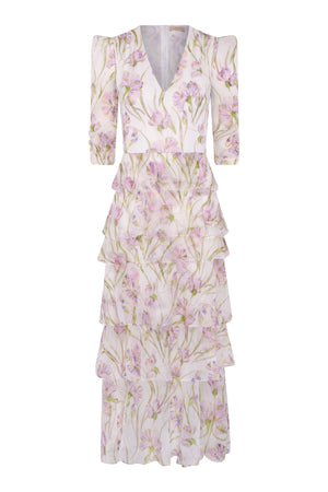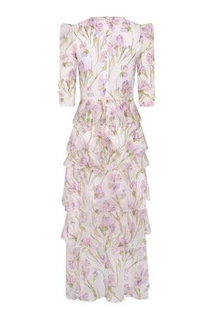 Ester dress is Vilshenko's bestselling piece, it is cut from extremely light silk chiffon in a custom iris print in lilac. It has puffed shoulders, 3/4 sleeves and tiered skirt. Perfect for a wedding, ascot or special occasion.