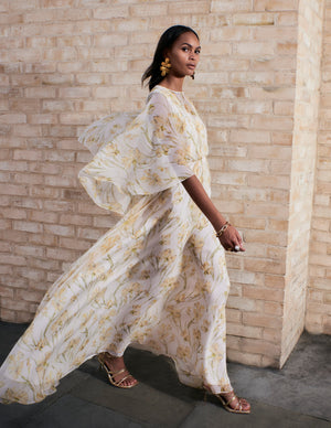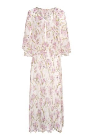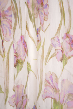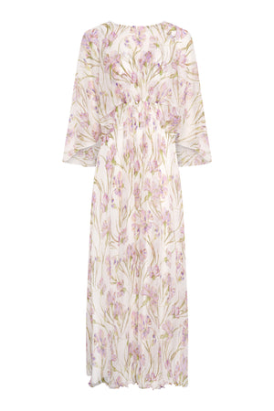 Fekla maxi dress is versatile and elegant, it is cut from light silk chiffon in a custom lilac iris print. The silhouette is inspired by ancient greek draping, featuring a cape that covers shoulders and back.