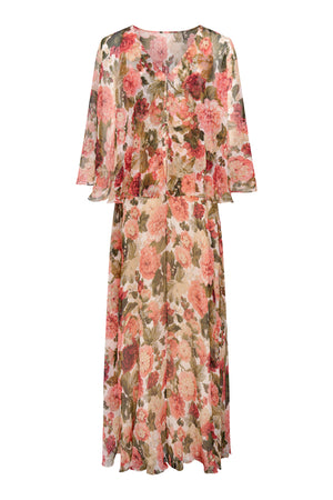 Fekla maxi dress is versatile and elegant, it is cut from light silk chiffon in a custom garden print with red peony. The silhouette is inspired by ancient greek draping, featuring a cape that covers shoulders and back.