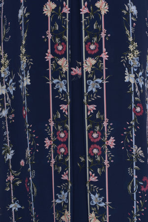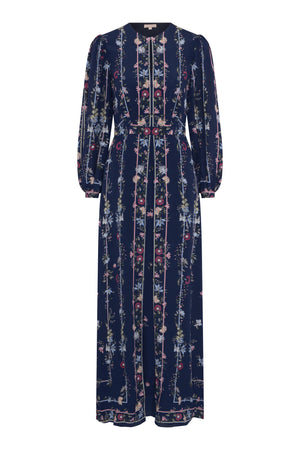 A long maxi dress is cut from thin silk in cream colour. It's finished with a custom floral frame print placement. The dress has a v-neck and long sleeves.