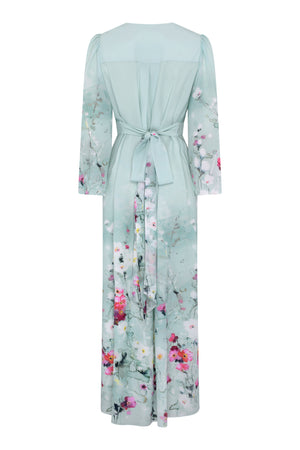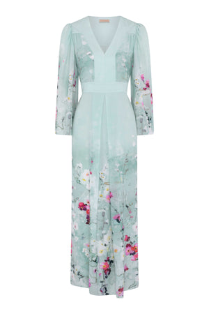 A long maxi dress is cut from thin silk in mint colour. It's finished with a custom degrade garden print placement with red and blue inserts, produced by our long standing partner in Italy. The dress has a v-neck and long sleeves. A perfect dress for a special occasion.