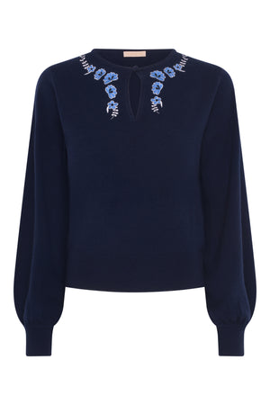 Floral garland embroidery wool and cashmere blend jumper. Long sleeves and tie-neck detail. Pair it with your favourite denim
