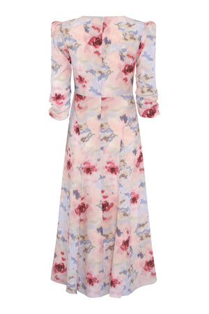Our bestselling silhouette, Vilshenko Tamara midi dress is extremely flattering featuring V-neck and 3/4 sleeves. Tamara dress is made from soft silk and covered with a cloud floral print. The fabric is soft, agile and doesn't crinkle easy.