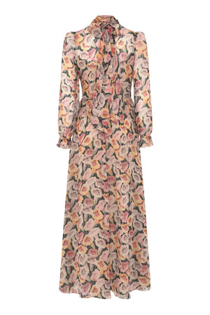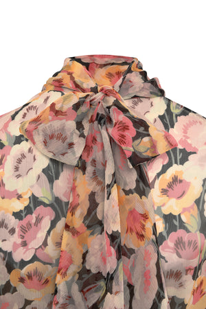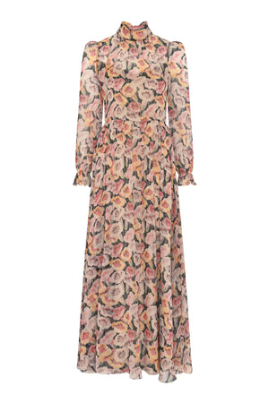 Veronika long dress is cut from airy and soft crinkled silk chiffon in a custom Petunia floral print. It has long sleeves, puffed shoulders and a neck tie collar. It's fully lined and comes with an underdress for a comfortable wear. Perfect dress for a black tie or a special occasion.