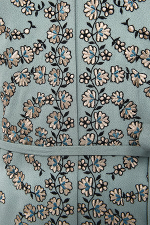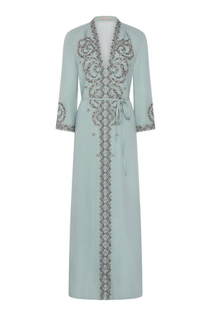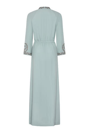 Adela dress is a gorgeous long dress, perfect pieces for a vacation. It features long sleeves, V-neck and a rushed back with the belt. It is lined with silk for a soft skin touch and hand finished with gorgeous vintage folk embroidery produced by our long-standing partners in India.