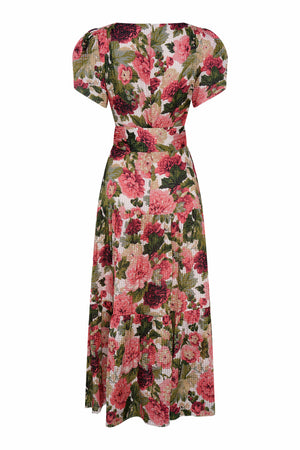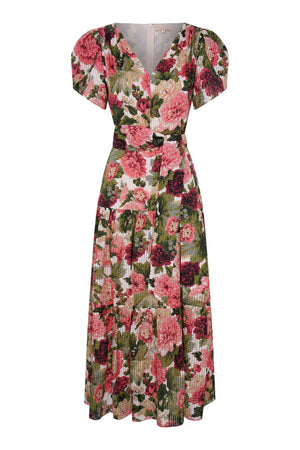 Lubava midi dress is a new addition to the VILSHENKO summer wardrobe collection. The iris print has been designed in our London studio. The silhouette exudes femininity, featuring a tiered skirt. The self-tie matching belt emphasise the waist, while the V-neckline and tulip sleeves create a vintage-inspired illusion.