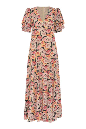Gorgeous Natalia dress has a vintage fill, inspired by 1920's it's cut from a soft and airy silk in a custom floral print. It has V-neck line, puff shoulder details and short voluminous sleeves. Perfect for a day and special occasion.