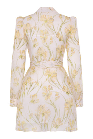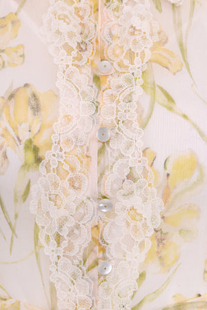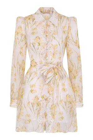 Selena button down mini dress is cut from extremely light silk chiffon in a custom Iris print. It has puffed shoulders and intricate lace details. Perfect for a wedding, party or a special occasion.