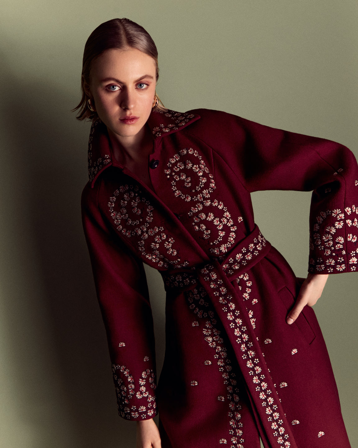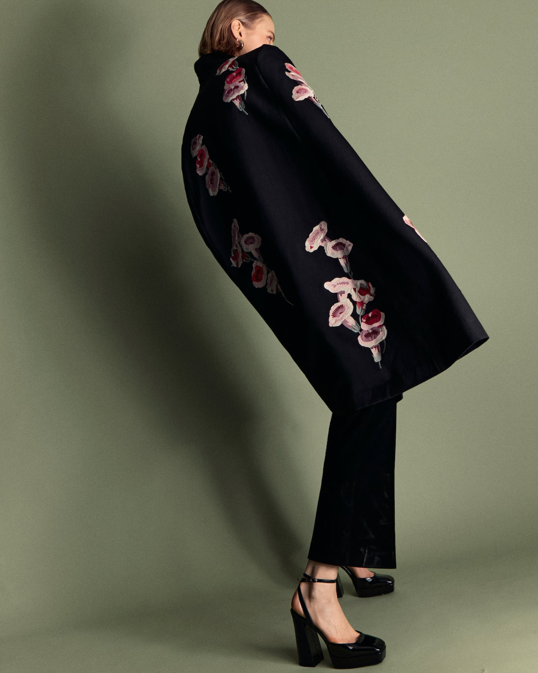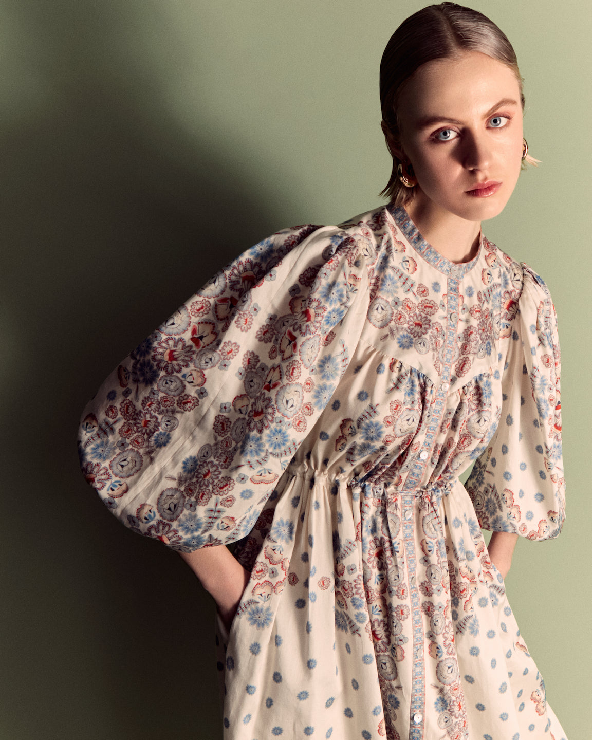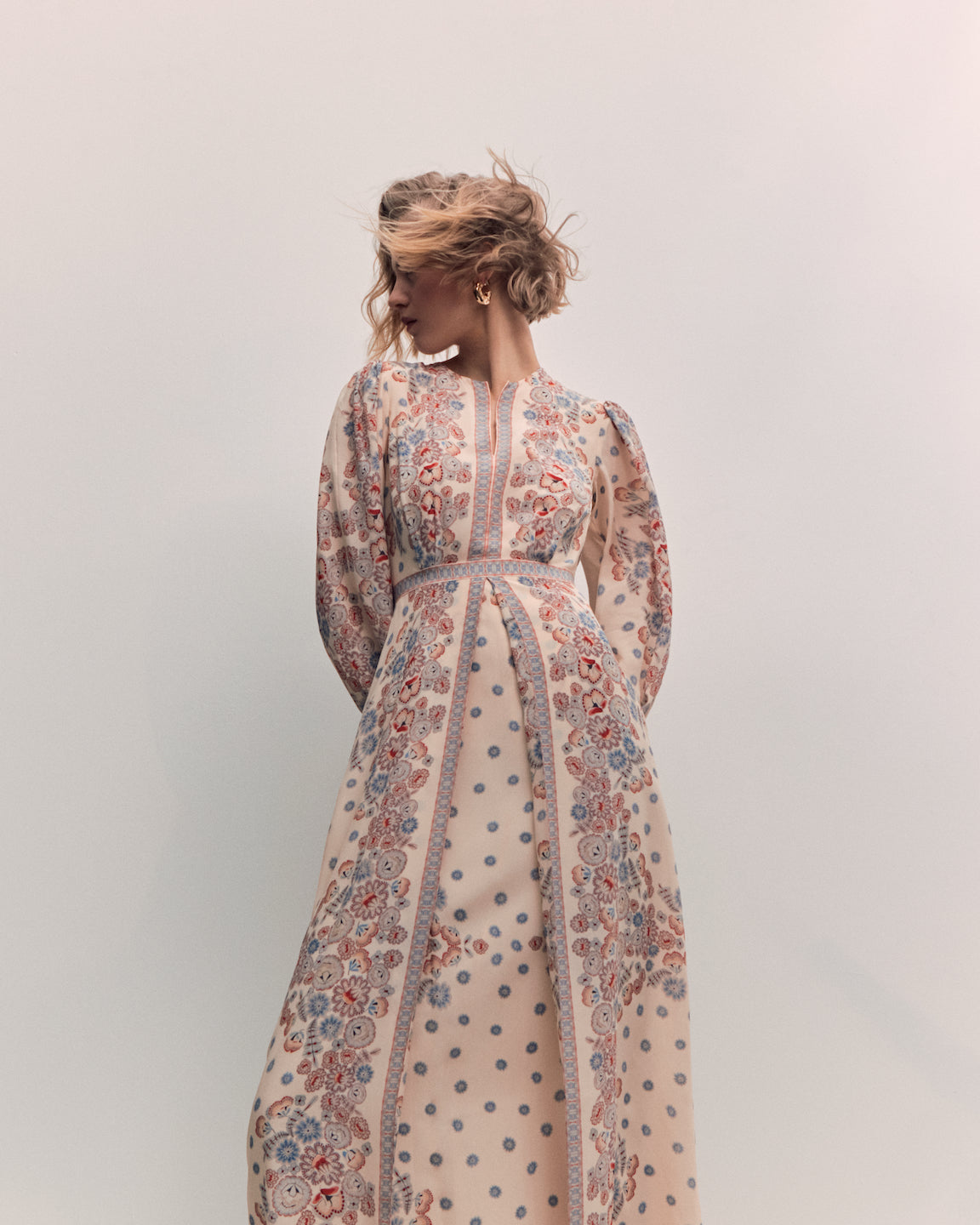 Inspired by the 20th-century romanticism, this collection seamlessly evolves from the vibrant embrace to the enchanting whispers. The silhouettes pay a heartfelt homage to the elegance of 1930s tea dresses and revive the timeless charm of archive floral prints and embroideries. Our signature pieces bloom like precious petals from the past. The season unfolds with a delicate floral Vintage Folk Print, a breath of warmth for sun-soaked days and high summer getaways. An antique 1930's Petunia print graces silk dresses, while intricate embroidery and applique adorn blouses and capes, adding a touch of gilded nostalgia. As the nights grow longer and the party season beckons, the easy-to-wear Daisy Chain print in Black or Emerald teams up with capes, coats, and boots, all in harmonious symphony.