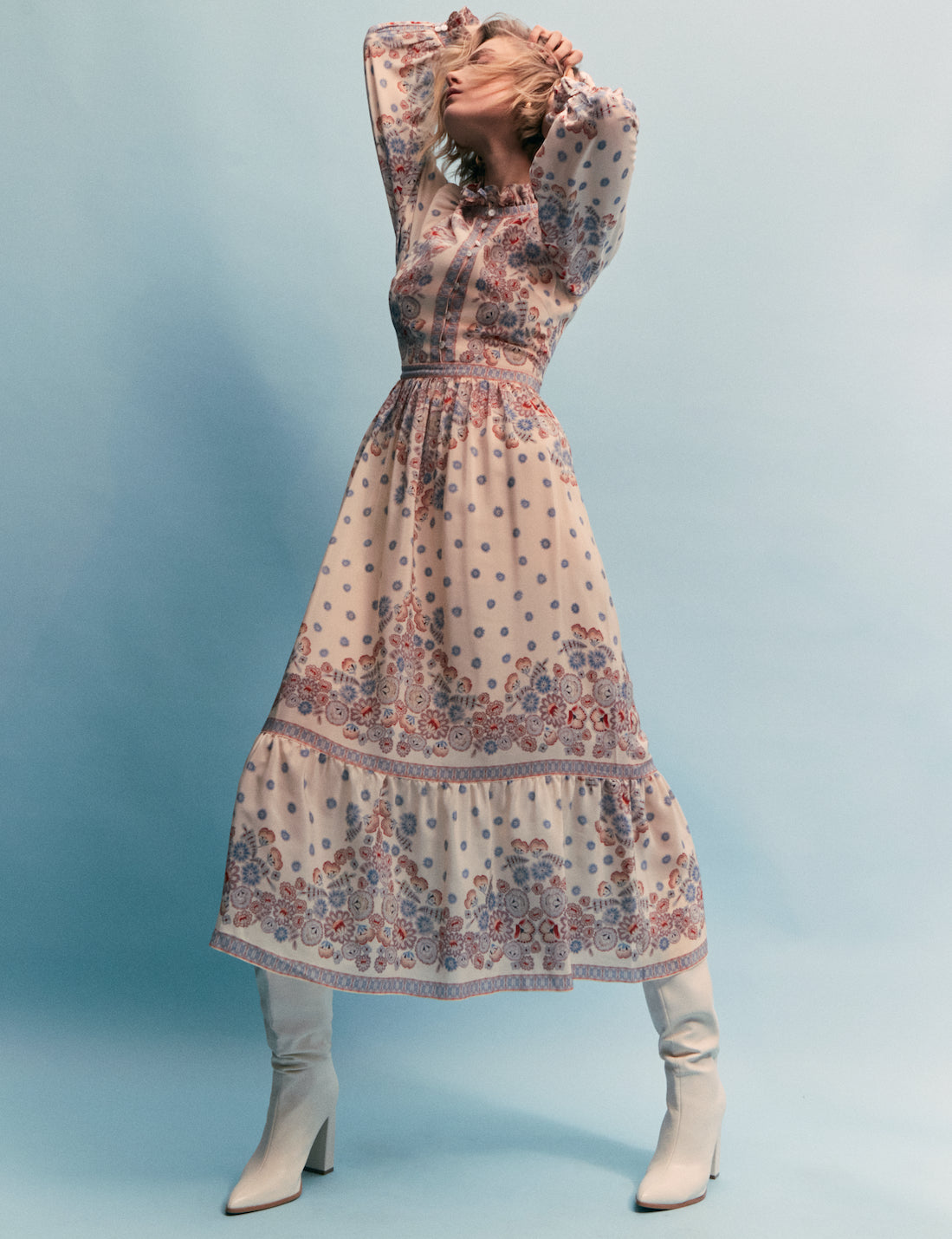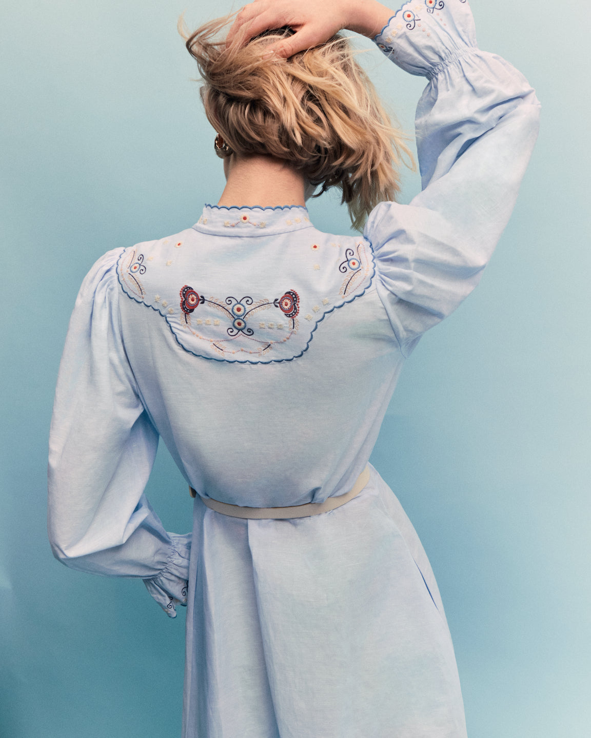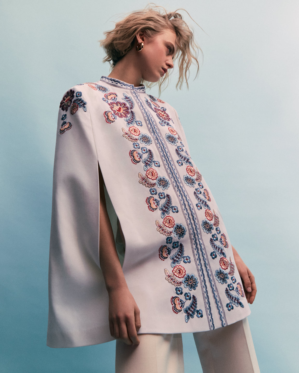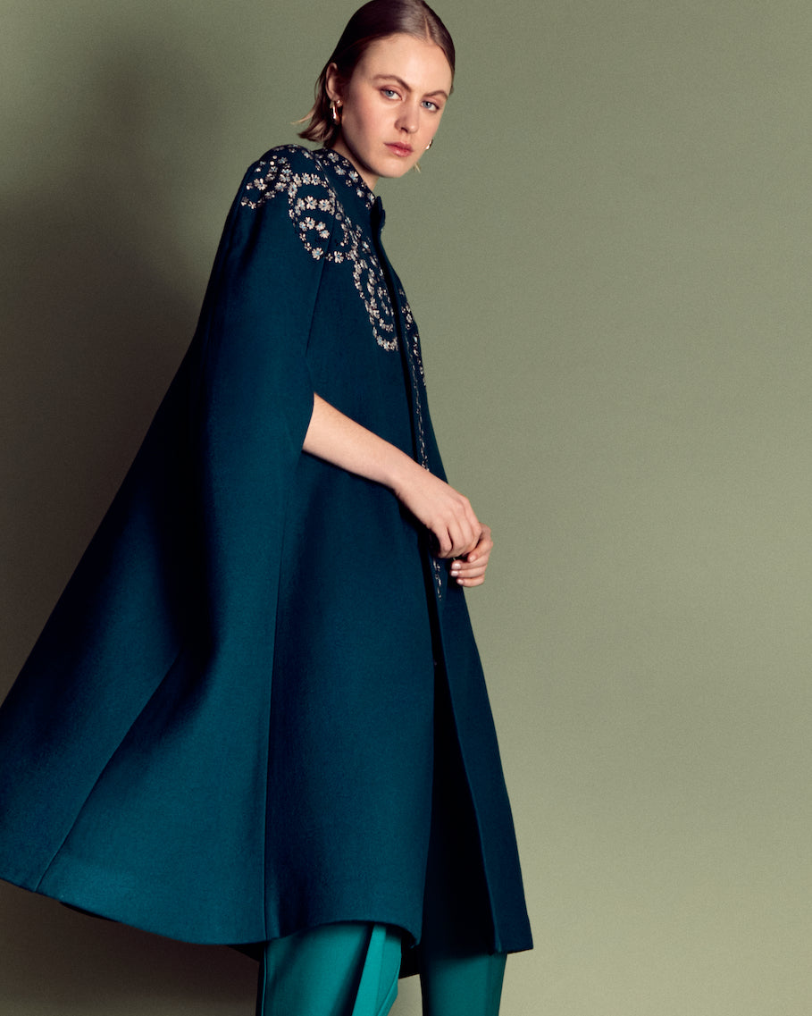 Inspired by the 20th-century romanticism, this collection seamlessly evolves from the vibrant embrace to the enchanting whispers. The silhouettes pay a heartfelt homage to the elegance of 1930s tea dresses and revive the timeless charm of archive floral prints and embroideries. Our signature pieces bloom like precious petals from the past. The season unfolds with a delicate floral Vintage Folk Print, a breath of warmth for sun-soaked days and high summer getaways. An antique 1930's Petunia print graces silk dresses, while intricate embroidery and applique adorn blouses and capes, adding a touch of gilded nostalgia. As the nights grow longer and the party season beckons, the easy-to-wear Daisy Chain print in Black or Emerald teams up with capes, coats, and boots, all in harmonious symphony.