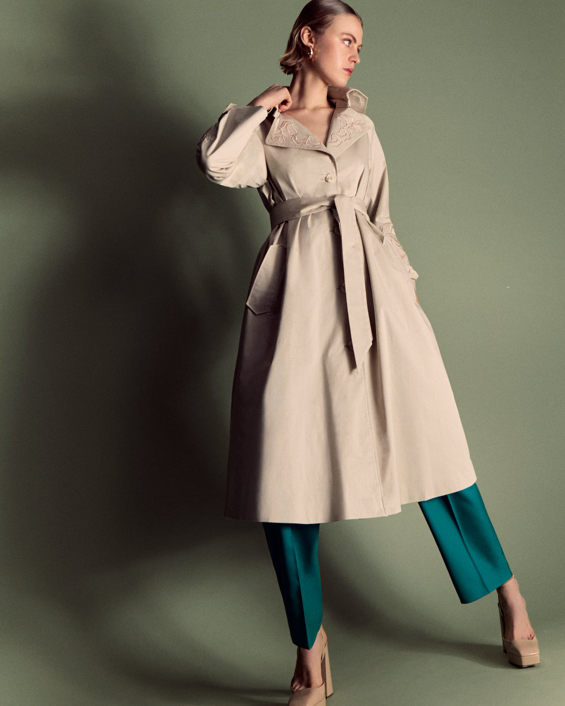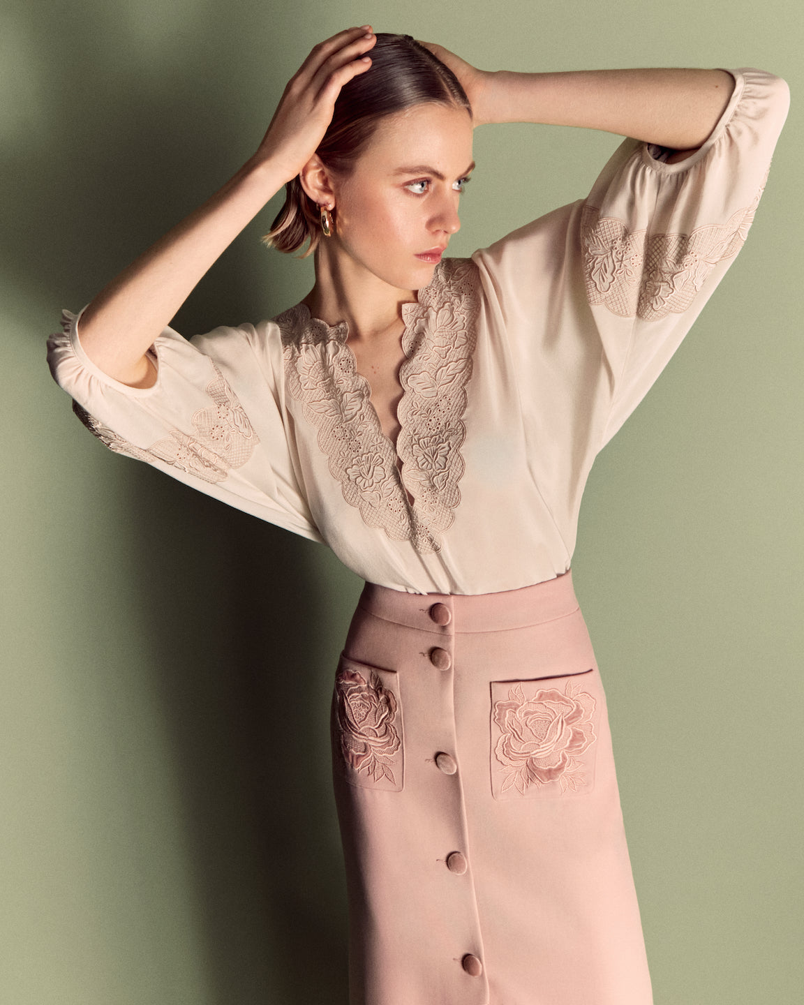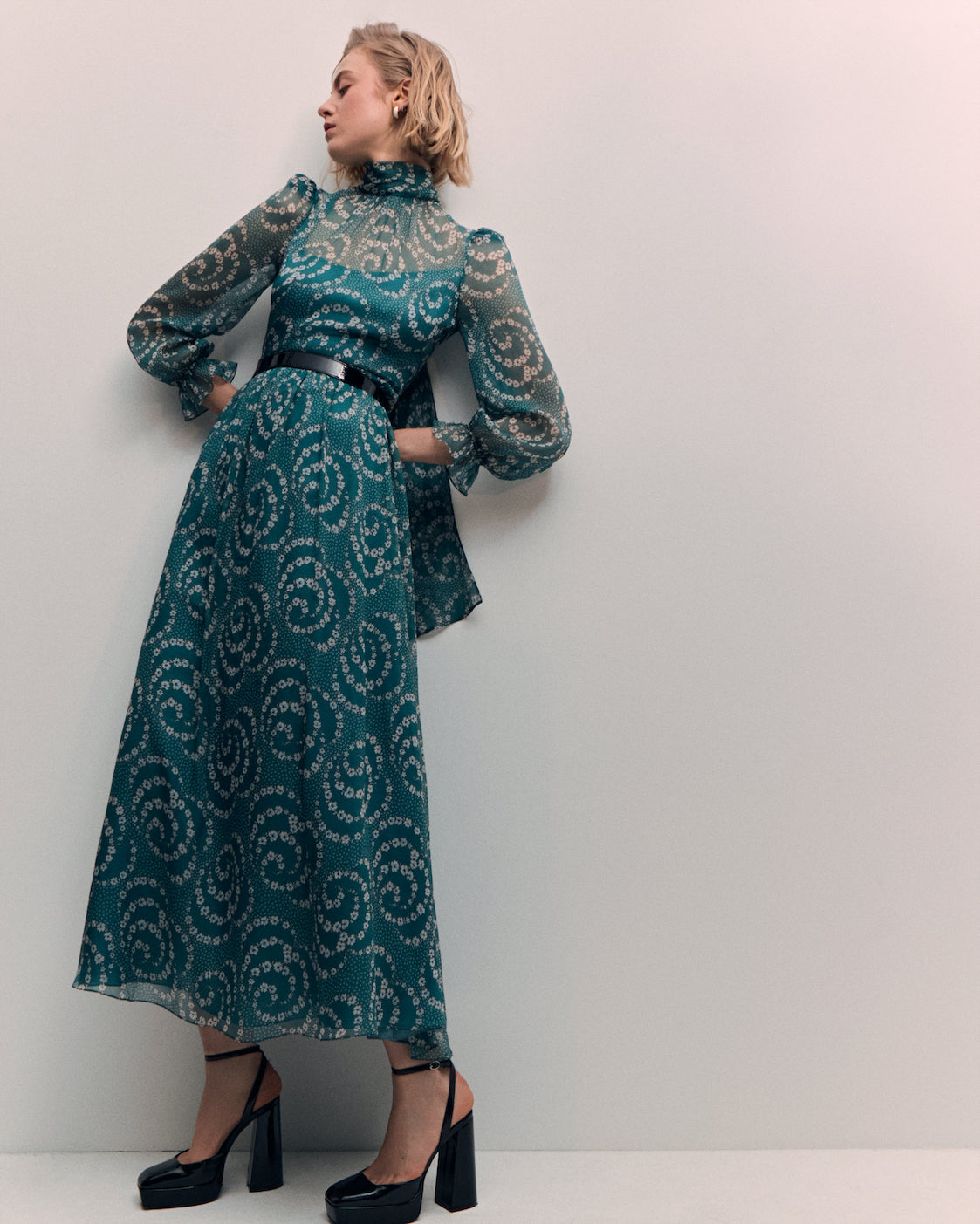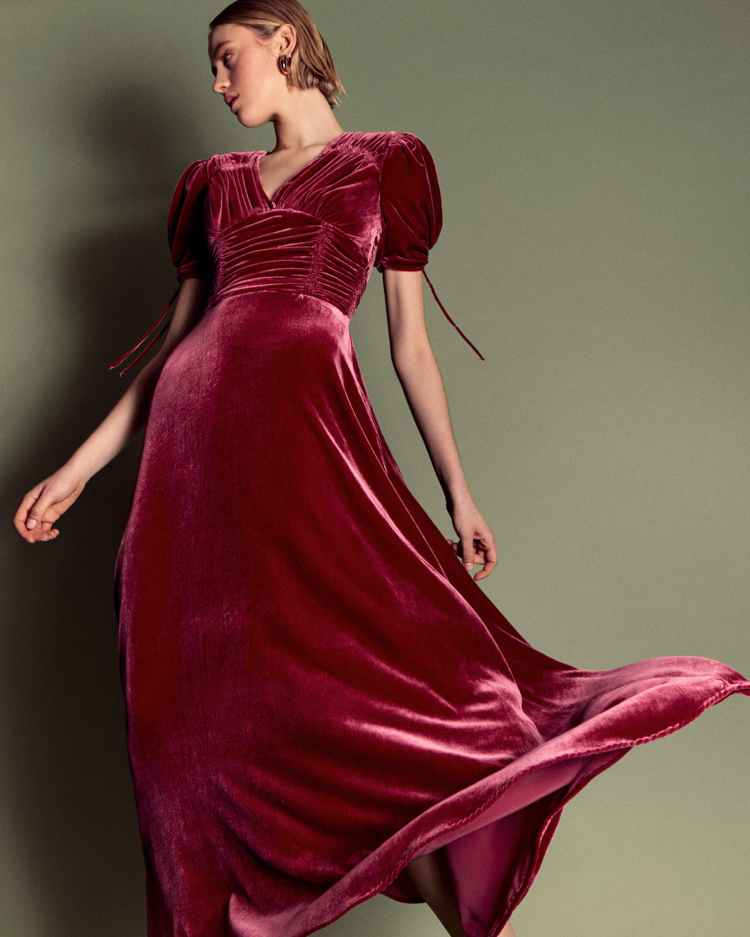 Inspired by the 20th-century romanticism, this collection seamlessly evolves from the vibrant embrace to the enchanting whispers. The silhouettes pay a heartfelt homage to the elegance of 1930s tea dresses and revive the timeless charm of archive floral prints and embroideries. Our signature pieces bloom like precious petals from the past. The season unfolds with a delicate floral Vintage Folk Print, a breath of warmth for sun-soaked days and high summer getaways. An antique 1930's Petunia print graces silk dresses, while intricate embroidery and applique adorn blouses and capes, adding a touch of gilded nostalgia. As the nights grow longer and the party season beckons, the easy-to-wear Daisy Chain print in Black or Emerald teams up with capes, coats, and boots, all in harmonious symphony.